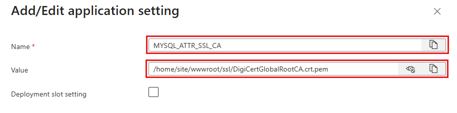 4. In Add/Edit application setting, in the Value field, copy the username and password for use later. The connection string lets you connect to the MySQL database secured behind private endpoints. The secrets are saved directly in the App Service app, which isn't the best. You'll change this configuration.
