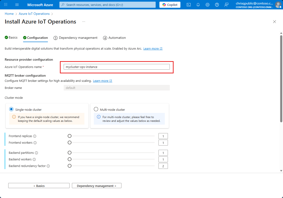 9. Azure IoT Operations uses namespaces to organize assets and devices. Each Azure IoT Operations instance uses a single namespace for its assets and devices. On the Dependency management tab, select an existing Azure Device Registry namespace or use these steps to create one: