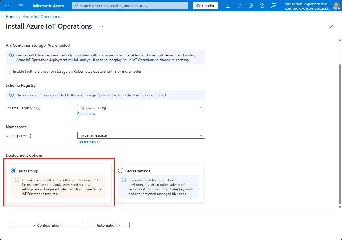 A screenshot that shows selecting test settings on the third tab for deploying Azure IoT Operations from the portal.