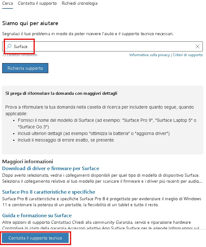 - Digita Surface, premi Invio e fai clic su "Contatta l'assistenza" in basso:
