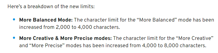 "in the More Creative and More Precise modes the limit was 4000 characters, while the More Balanced mode was limited to 2000 characters."