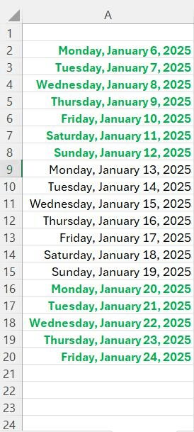 - DATE(2025,1,6) is a Monday (January 6, 2025). You can adjust this to your actual starting Monday.