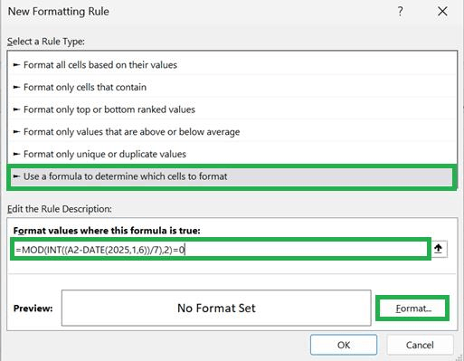 - Enter the following formula: =MOD(INT((A2-DATE(2025,1,6))/7),2)=0