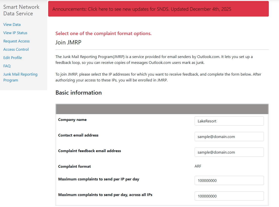 After reviewing the registration process for the Junk Email Reporting Program, I encountered a similar message to what you described: “Select one of the complaint format options.”