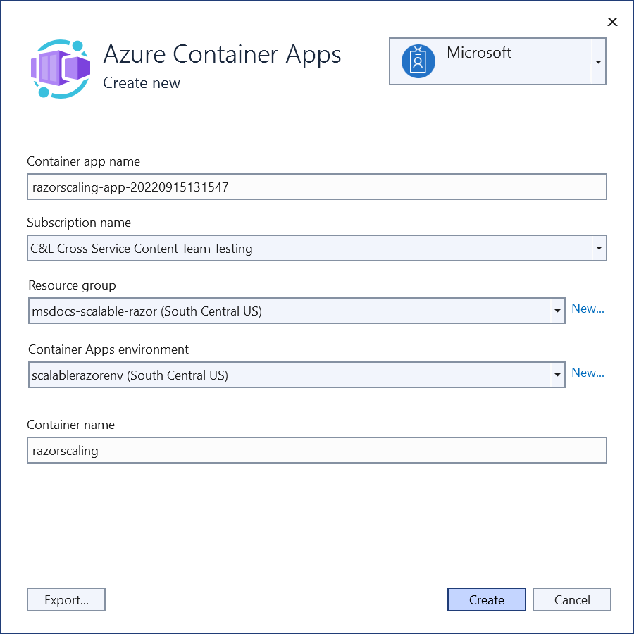 - Select Create to close the original container apps dialog. Visual Studio creates the container app resource in Azure.
