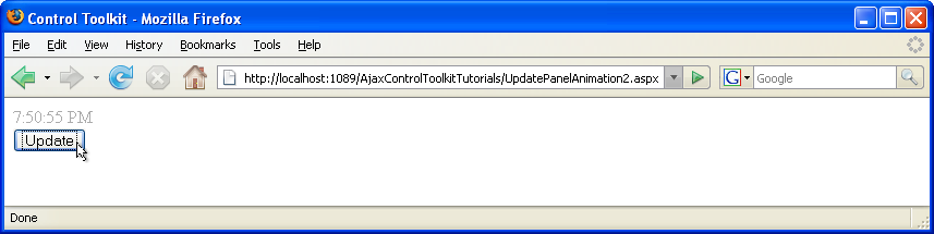 Finally, the UpdatePanelAnimationExtender must be configured: Set the TargetControlID attribute to the ID of the panel, and define an animation within the extender. Fading in makes sense, which creates a nice visual emphasis on the updated time. Your extender markup may then look like this: