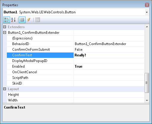 6. Select the Button control in the Designer and expand the Extenders, Button1_ConfirmButtonExtender node in the Properties window (see Figure 6). Assign the value 'Really?' to the ConfirmText property.