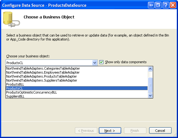 The Caching Layer s classes and methods can be used to work with data using the techniques we ve examined throughout these tutorials. To illustrate working with cached data, save your changes to the ProductsCL class and then open the FromTheArchitecture.aspx page in the Caching folder and add a GridView. From the GridView s smart tag, create a new ObjectDataSource. In the wizard s first step you should see the ProductsCL class as one of the options from the drop-down list.