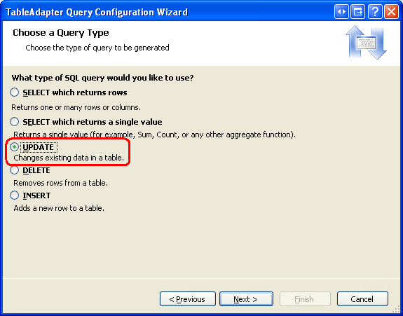 Open the Typed DataSet and, from the Designer, right-click on the CategoriesTableAdapter s header and choose Add Query from the context menu to launch the TableAdapter Query Configuration Wizard. This wizard starts by asking us how the TableAdapter query should access the database. Choose Use SQL statements and click Next. The next step prompts for the type of query to be generated. Since we re creating a query to add a new record to the Categories table, choose UPDATE and click Next.