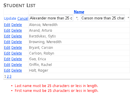 Edit a row and try to clear the values in the name fields. The asterisks indicating field errors appear as soon as you leave a field, before you click Update. When you click Update, the page displays the error message text you specified.