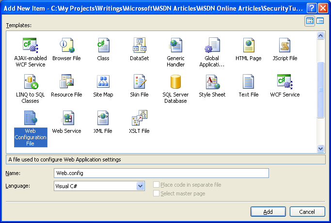 Figure 7: If Your Project Does Not Yet Include Web.config, Add It Now (Click to view full-size image)