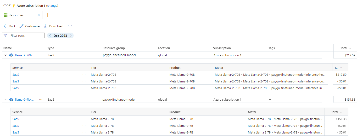 Each time a project subscribes to a given offer from Azure Marketplace, a new resource is created to track the costs associated with its consumption. The same resource is used to track costs associated with inference and fine-tuning; however, multiple meters are available to track each scenario independently.