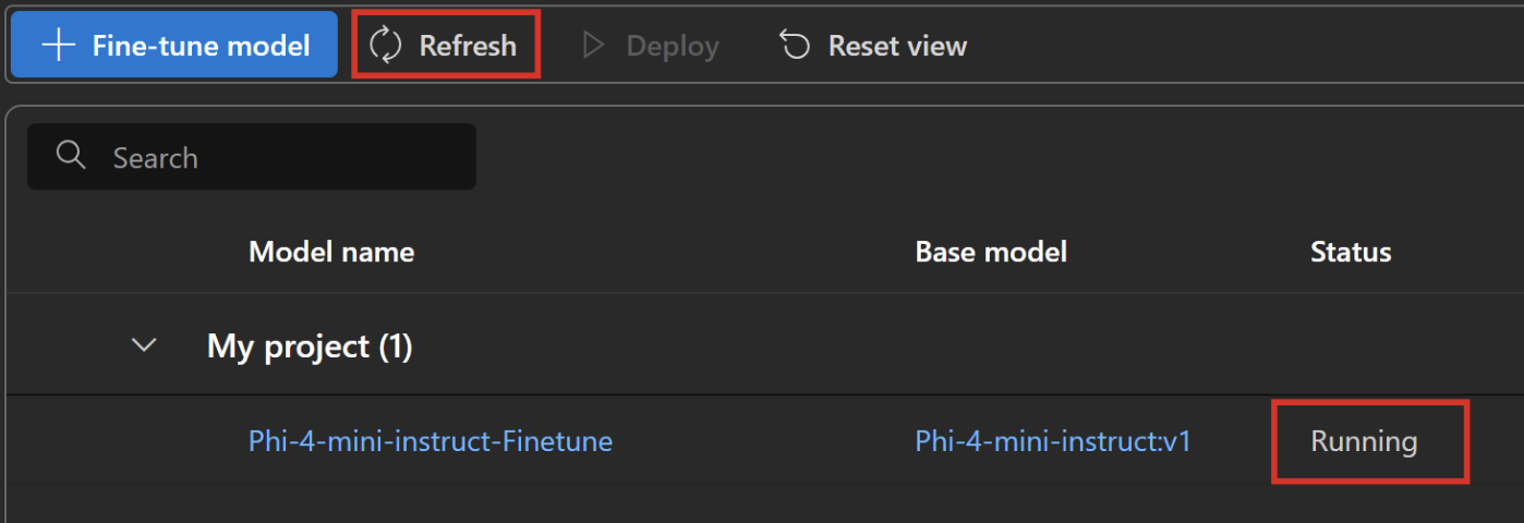 • Check the status of the fine-tuning job for your custom model in the Status column of the Customized models tab.