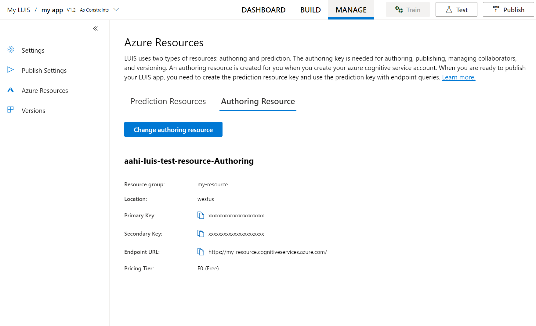 - A LUIS resource with the free (F0) or standard (S) pricing tier.