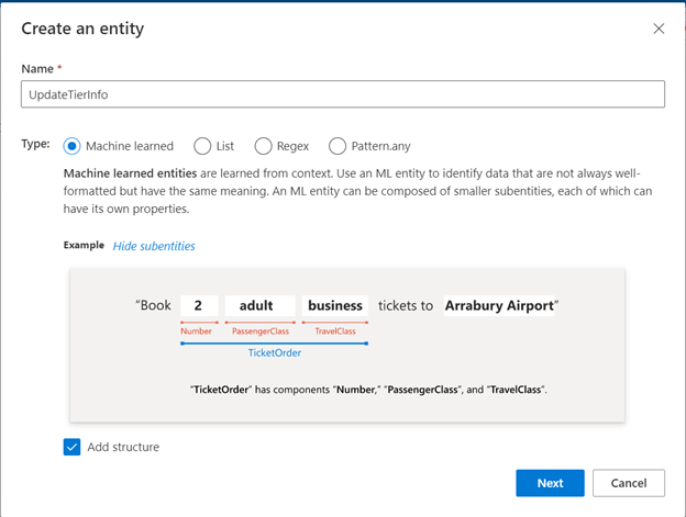 In the window that appears, enter "UpdateTierInfo", and select Machine learned from the available types. Select the Add structure box to be able to add a structure to this entity.