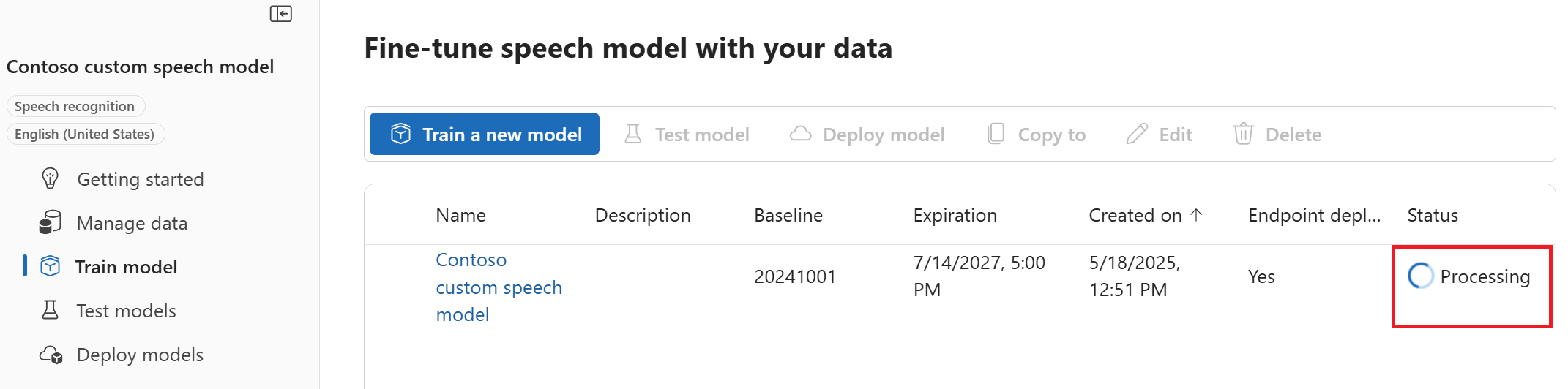 8. Review the settings and select Train a new model. You're taken back to the Train model page. The status of the data is Processing.