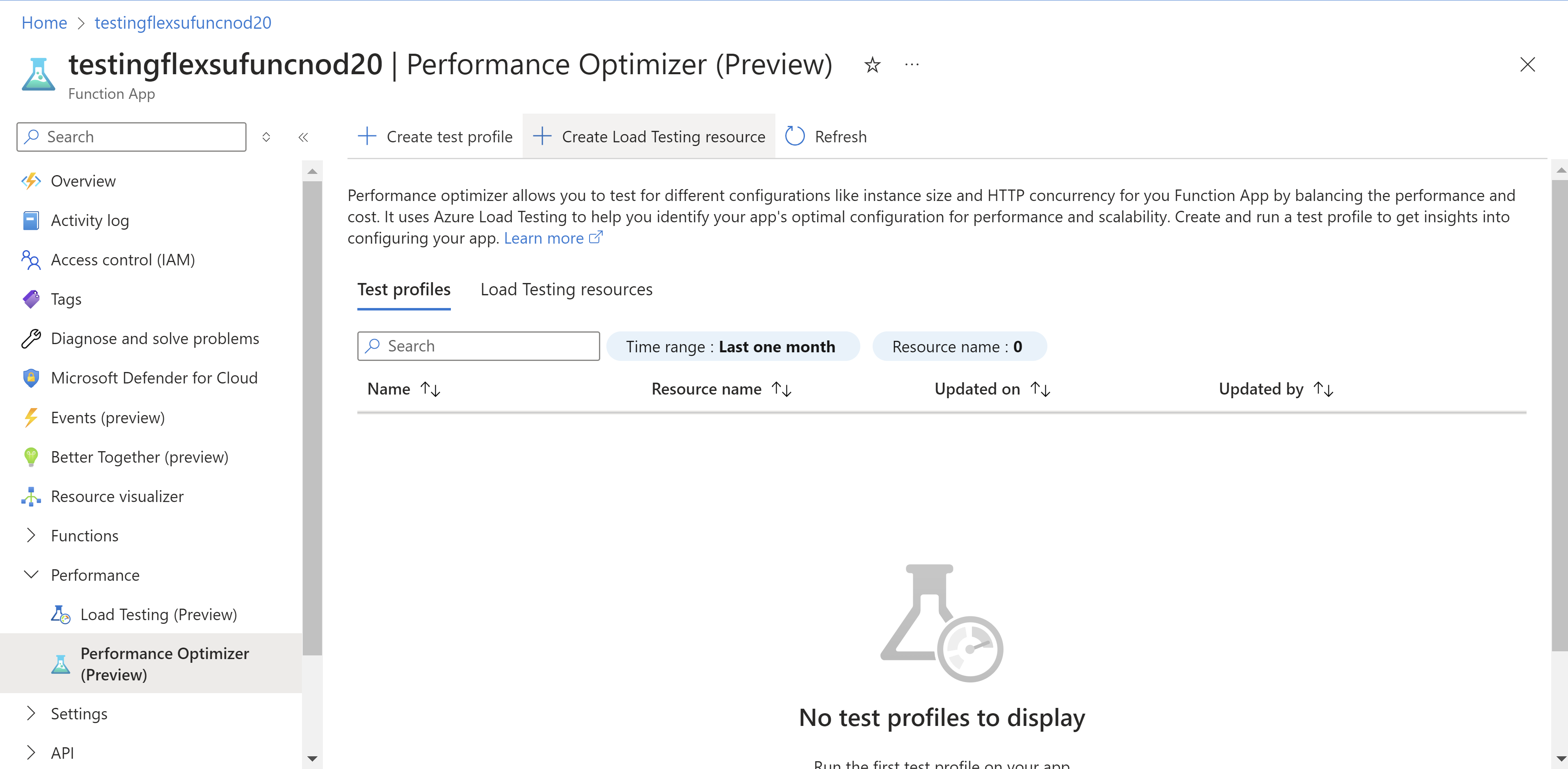 Performance optimizer allows you to test different configurations to help you find the right balance of performance vs. cost. For instance, you can test metrics like instance size and HTTP concurrency amounts for your Functions app. The performance optimizer uses Azure Load Testing to help you identify your app's optimal configuration for performance and scalability. You can run the performance optimizer on your functions with HTTP triggers. Once you deploy your code to Azure Functions, use the following steps to run the optimizer.