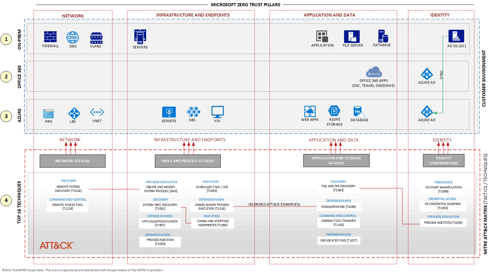 This diagram shows the top 16 threats, according to the tactics and techniques as published by The MITRE Corporation. In red lines, you can see an example of a blended attack, which means that a malicious actor might coordinate multiple attacks simultaneously.