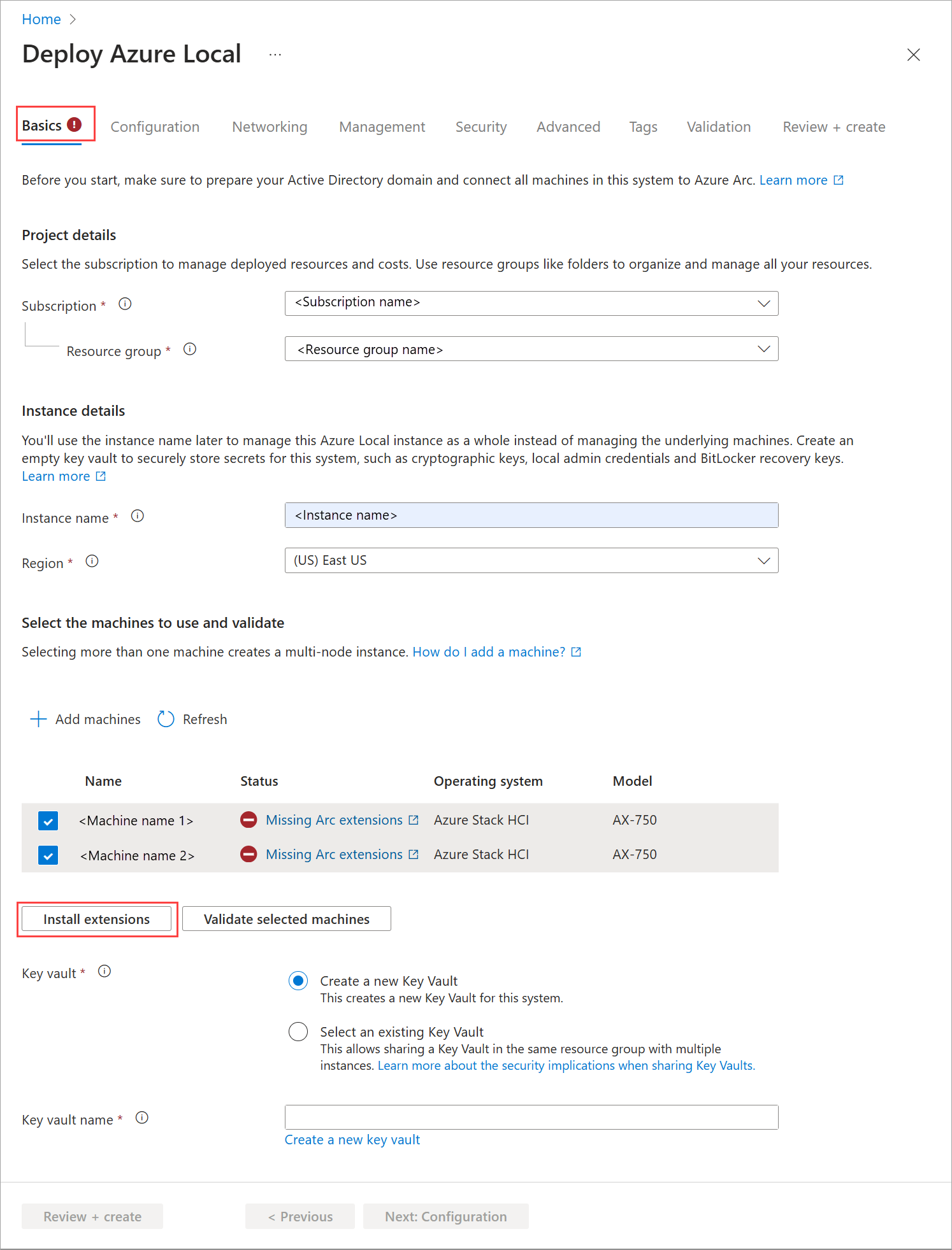 Select an existing Key Vault or select Create a new Key Vault. Create an empty key vault to securely store secrets for this system, such as cryptographic keys, local admin credentials, and BitLocker recovery keys.