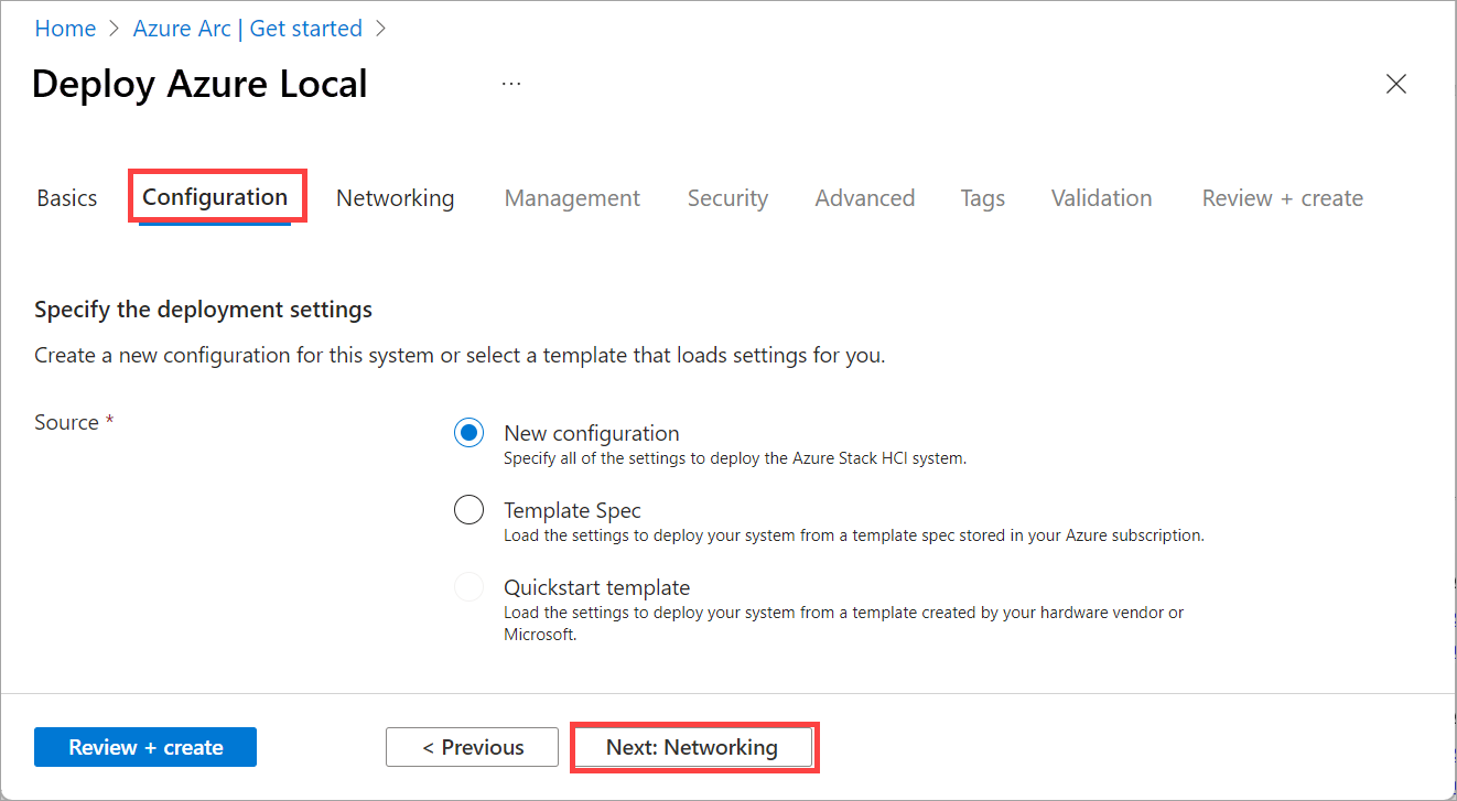 On the Configuration tab, choose whether to create a new configuration for this system or to load deployment settings from a template–either way you are able to review the settings before you deploy: