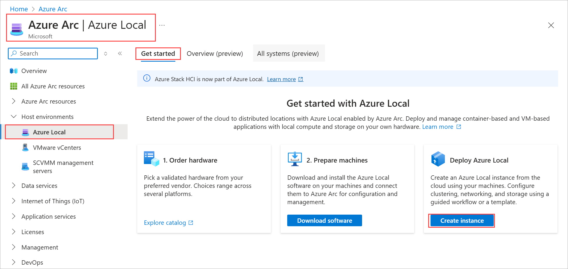 Go to the Azure portal. Search for and select Azure Local. On the Azure Arc|Azure Local, go to the Get started tab. On the Deploy Azure Local tile, select Create instance.