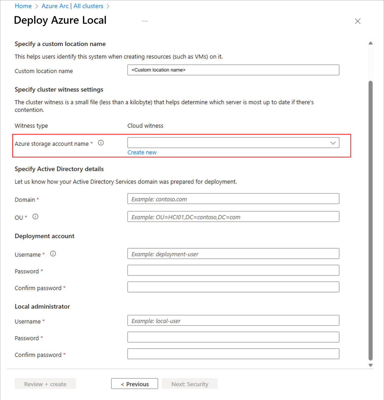 When selecting an existing account, the dropdown list filters to display only the storage accounts contained in the specified resource group for deployment. You can use the same storage account with multiple clusters; each witness uses less than a kilobyte of storage.