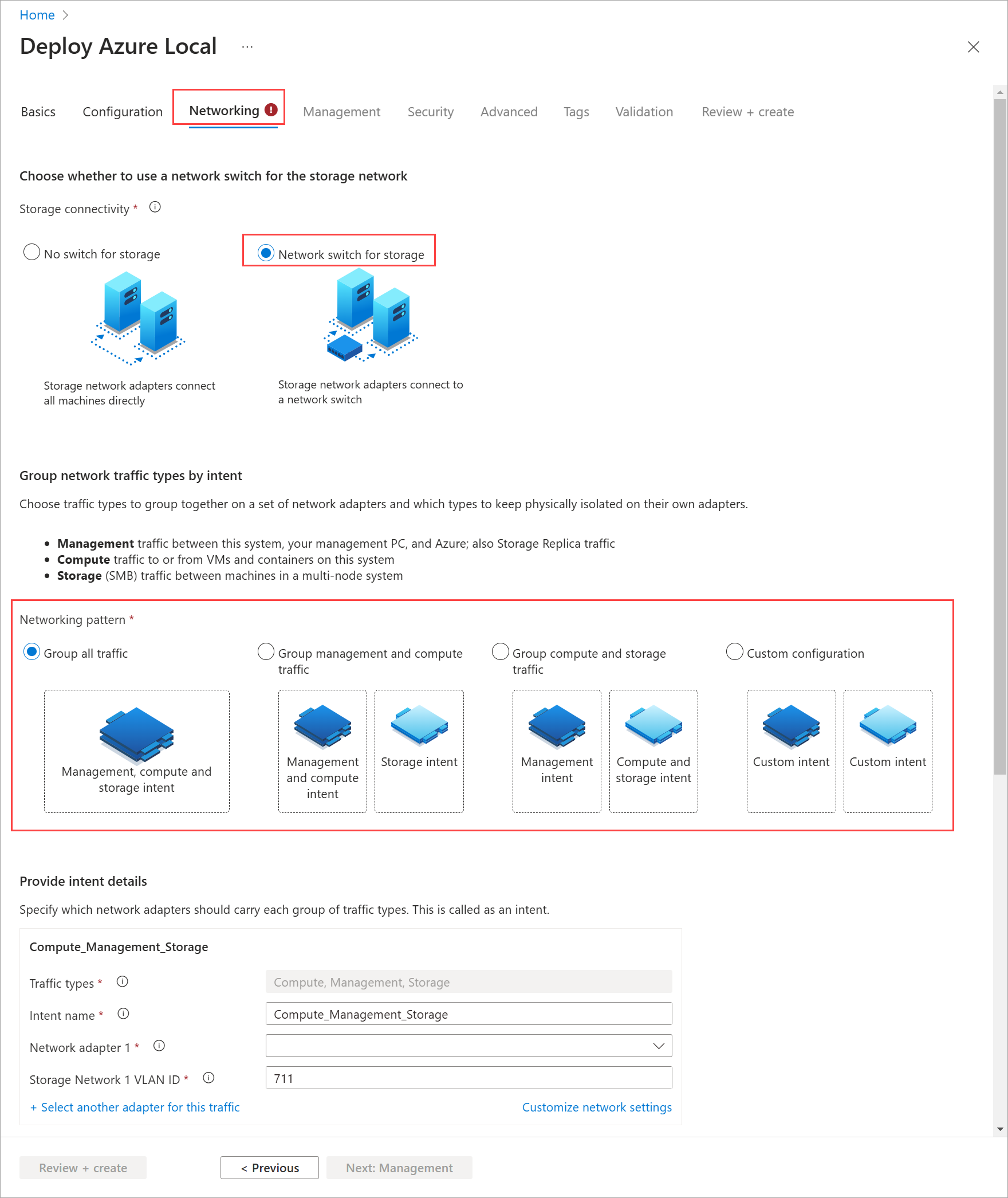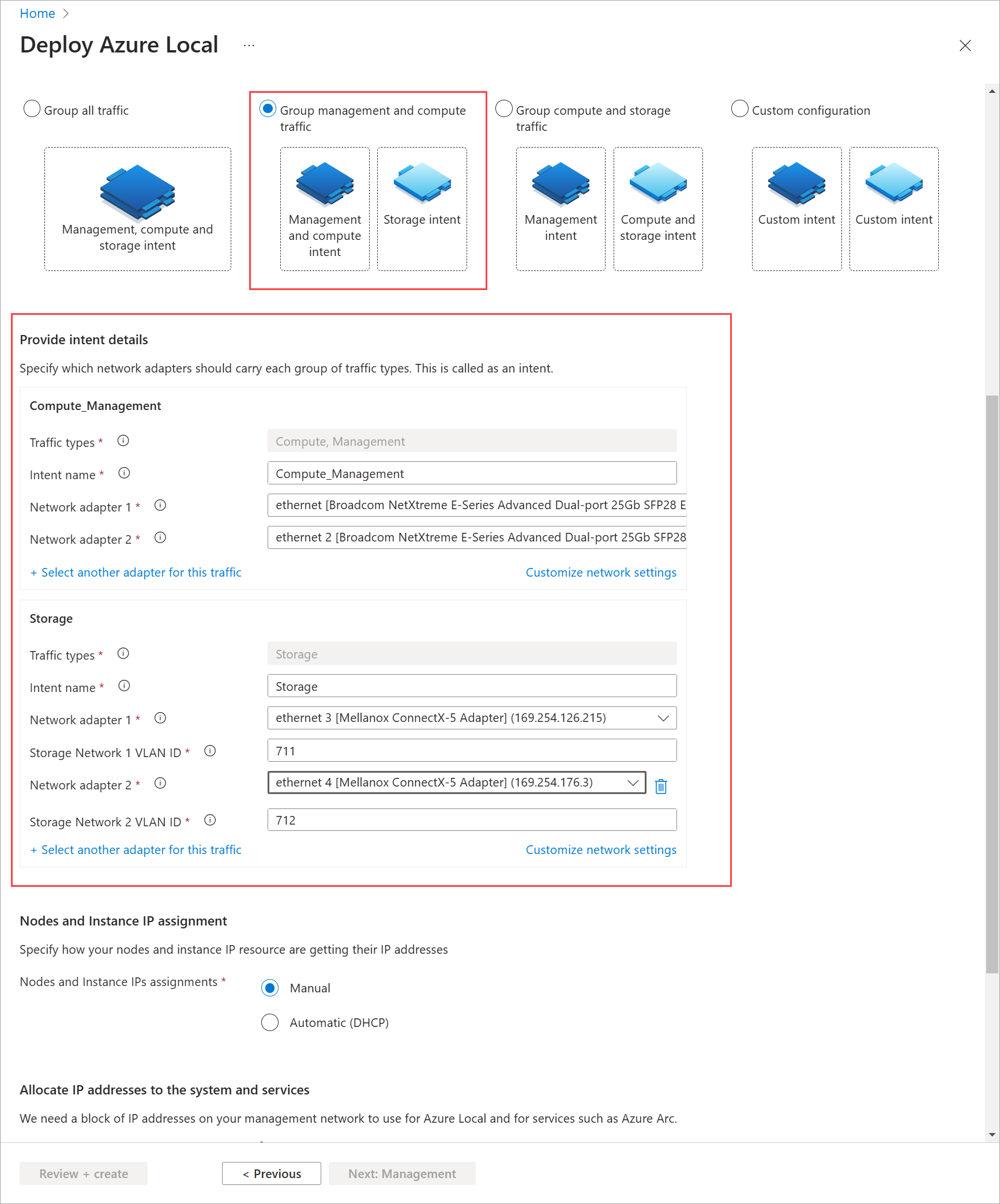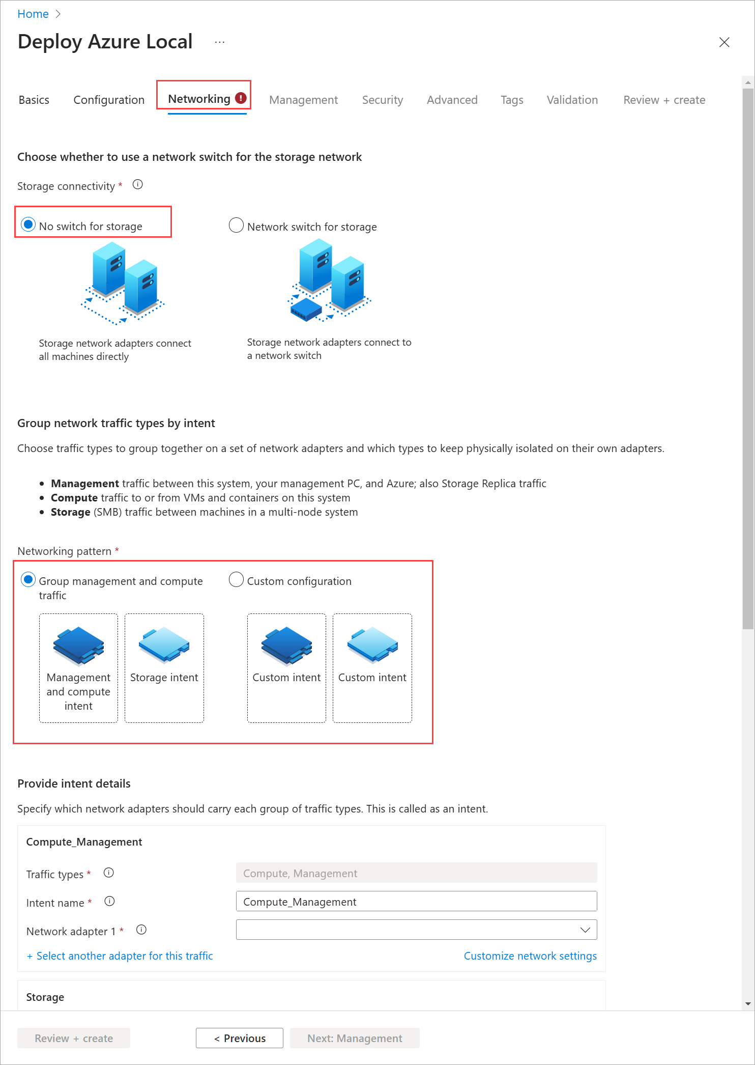 Group compute and storage traffic - If you're using network switches for storage traffic, you can group compute and storage traffic together on your high-speed adapters while keeping management traffic isolated on another set of adapters. You create two network intents: