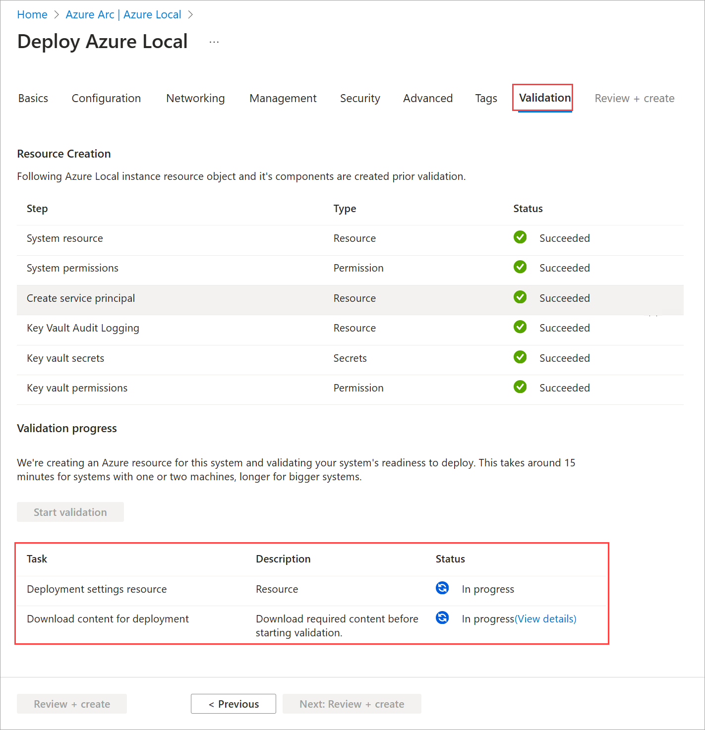 The validation takes about 15 minutes to deploy one to two machines and longer for bigger deployments. Monitor the validation progress.