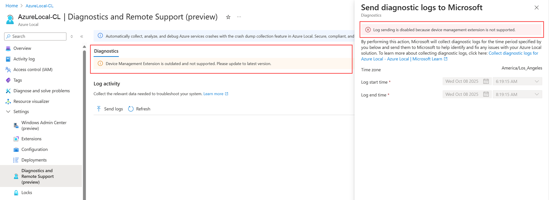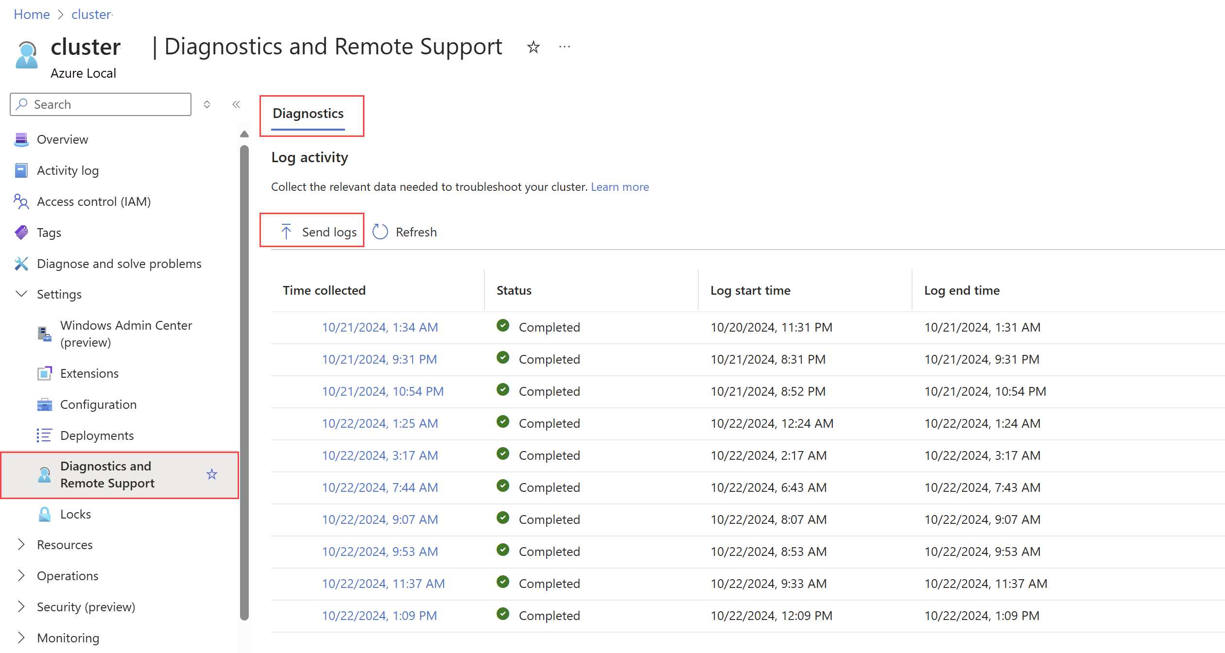 To use PowerShell for log collection, run the Send-DiagnosticData cmdlet from any node within the Azure Local instance. This cmdlet temporarily copies the logs locally. The copied logs are parsed, sent to Microsoft, and then deleted from your system.