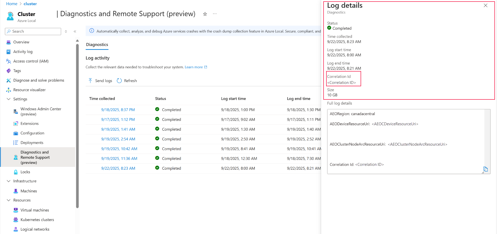 The correlation Id is <Correlation-ID>. This is used to query for this log collection in the diagnostic pipeline.