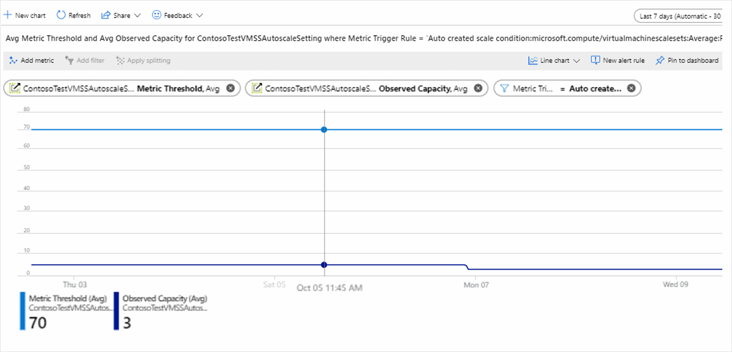 - Metric Threshold: The threshold you set to take the scale action. Because a single autoscale setting can have multiple rules and therefore multiple metric sources, you can filter by using "metric rule" as a dimension.
