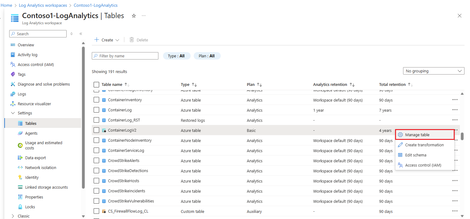 The Table plan dropdown is enabled only for tables that support Basic logs.