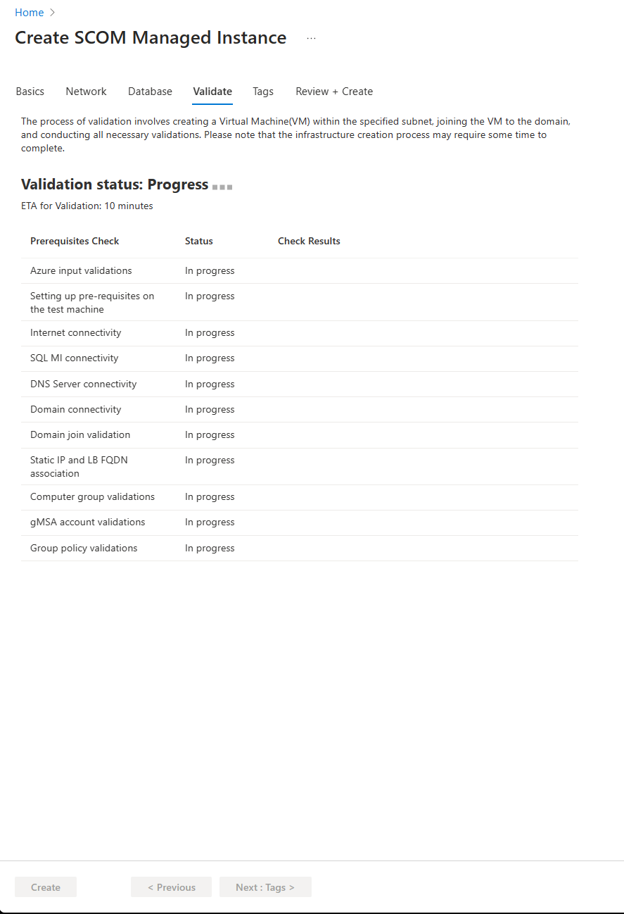 10. Under Validate, all the prerequisites are validated. It takes 10 minutes to finish the validation.