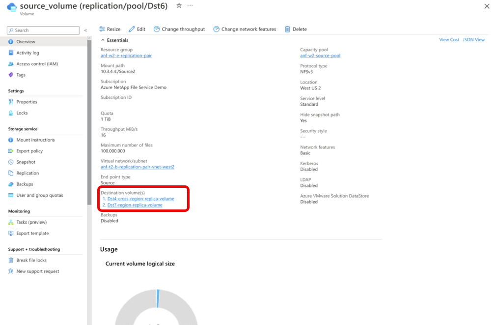 6. In the source volume’s menu, select Replication. Confirm there are two volumes listed under Destination volumes.