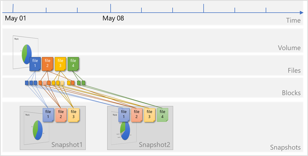 Snapshot1is taken, which copies the metadata and only the pointers to the blocks that represent the files:Files on the volume continue to change, and new files are added. Modified data blocks are written as new data blocks on the volume. The blocks that were previously captured in