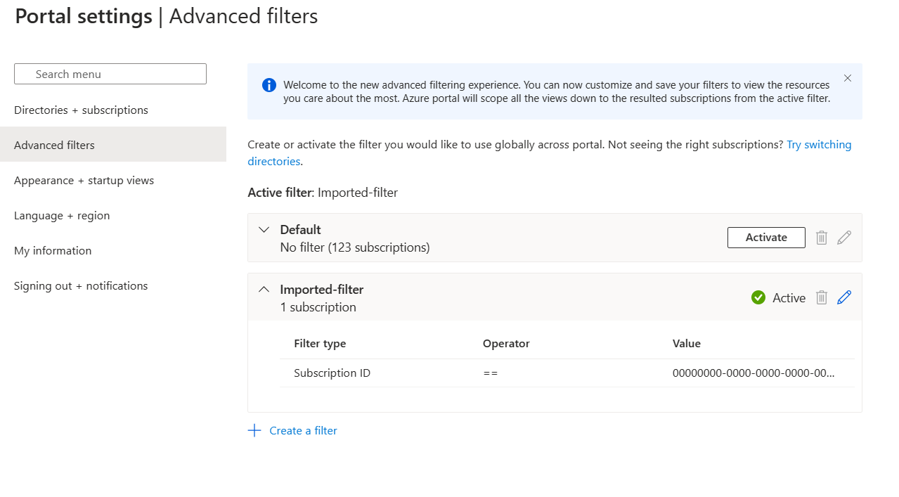 After you continue, Advanced filters appears in the left navigation menu of Portal settings. You can create and manage multiple subscription filters here. Your currently selected subscriptions are saved as an imported filter that you can use again. You'll see this filter selected in Directories + subscriptions.