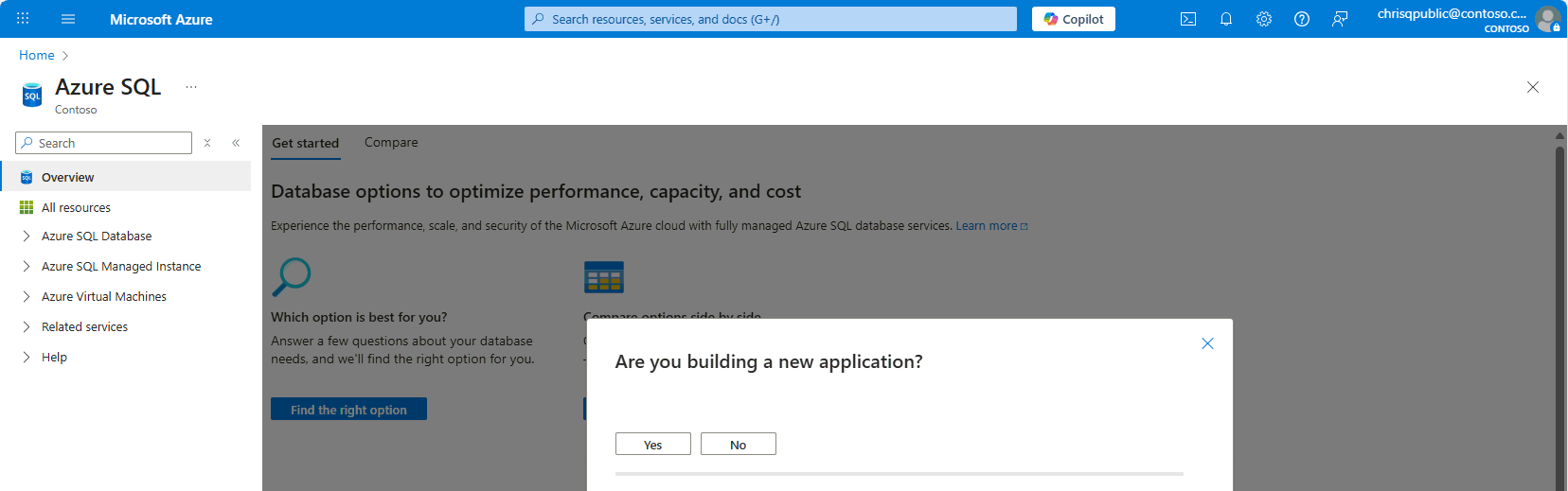 The Azure SQL hub includes Find the right option and Compare options informative helpers.