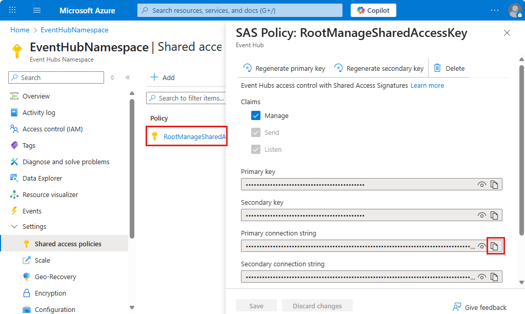 To confirm that your connection string belongs to your Event Hubs namespace, and not a specific event hub, make sure the connection string doesn't have the