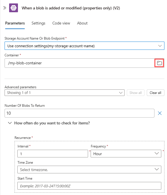 For more information, review Azure Blob Storage managed connector trigger properties.