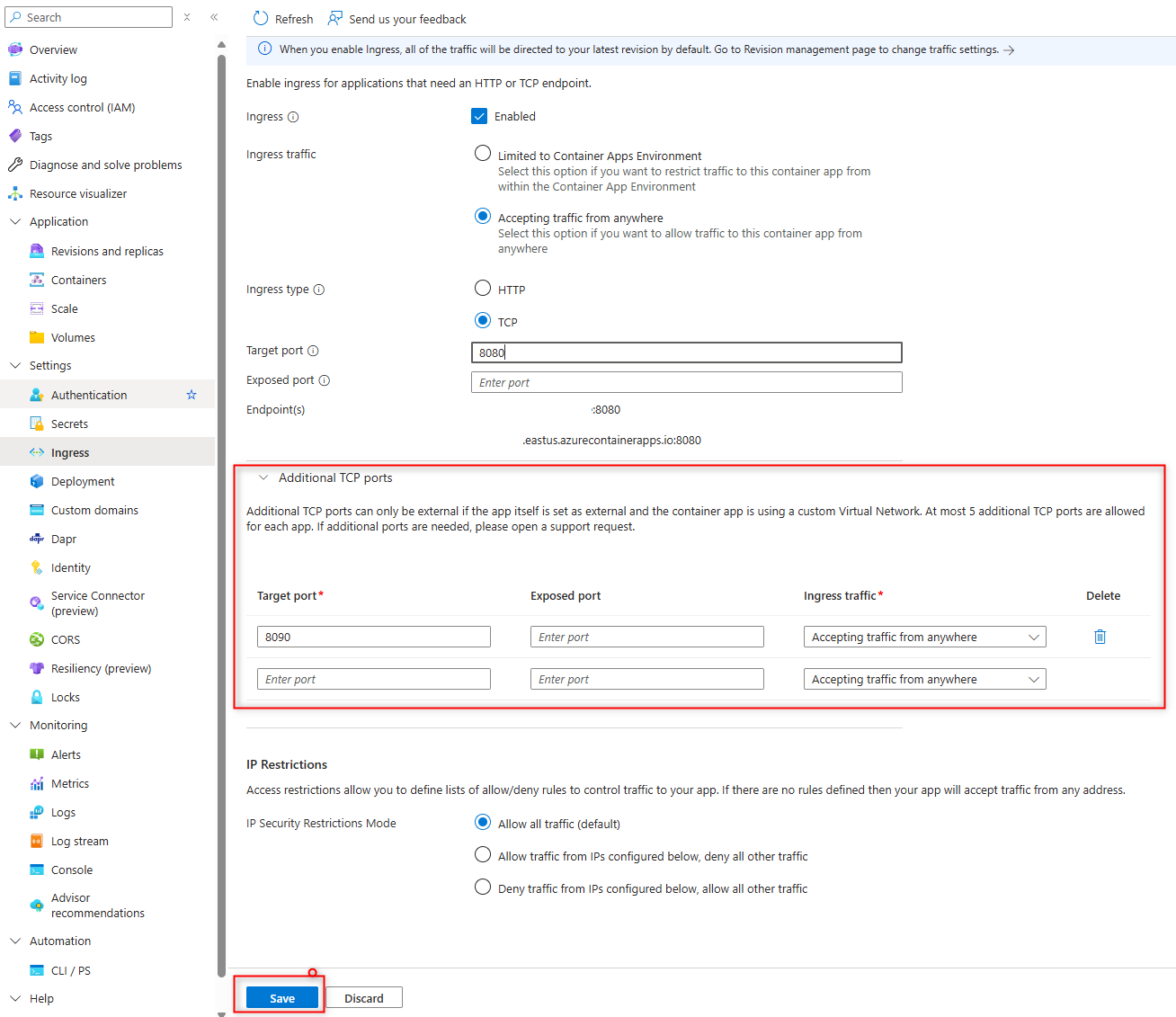 The Ingress settings page for your container app also allows you to configure IP Restrictions. For information to configure IP restriction, see IP Restrictions.