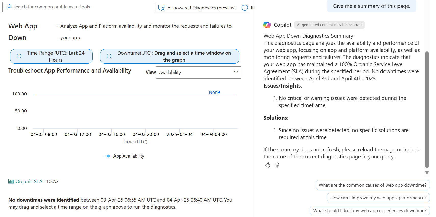 You can tell Azure Copilot "my web app is down." After you select the resource that you want to troubleshoot, Azure Copilot runs diagnostic checks to identify the cause of the problem.