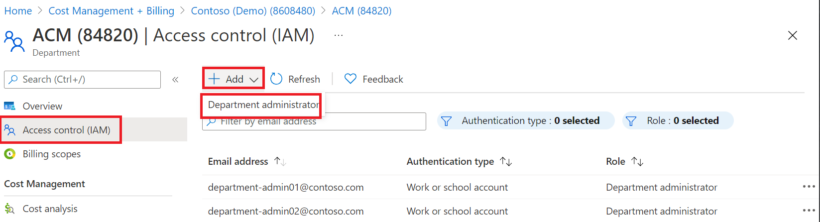 7. Select + Add, then select Department administrator.