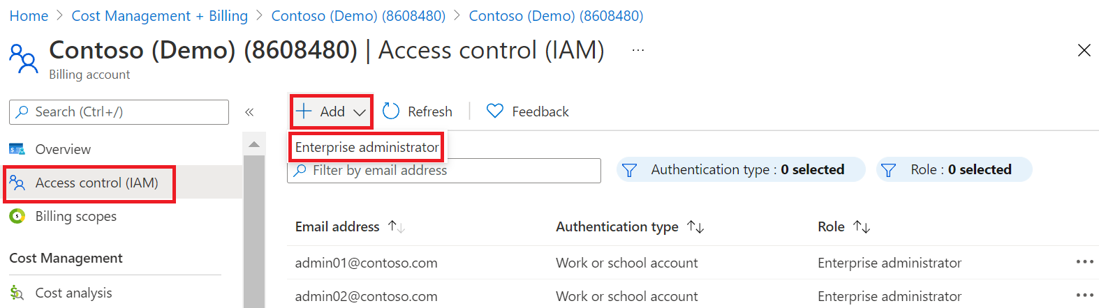 5. In the top menu, select + Add , and then select Enterprise administrator.