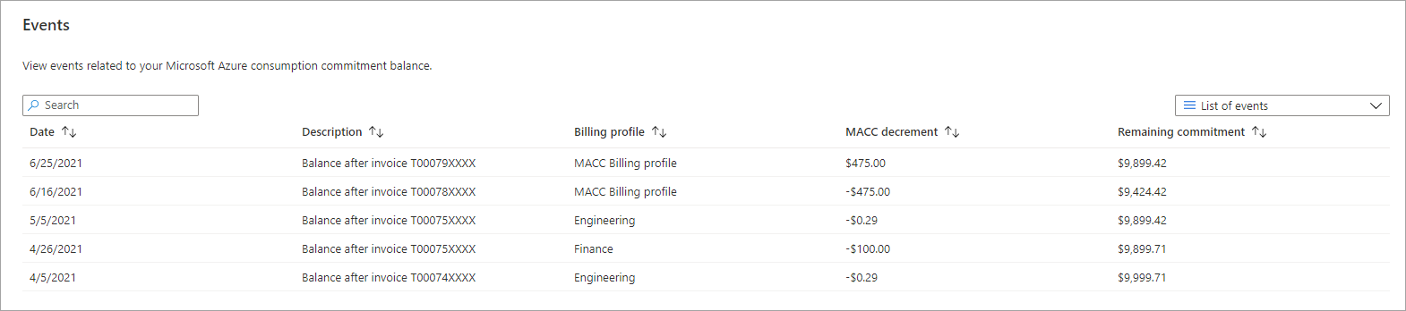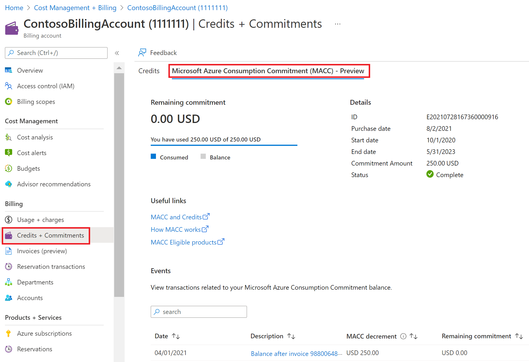The Events section displays events (invoiced spend) that decremented your MACC commitment.