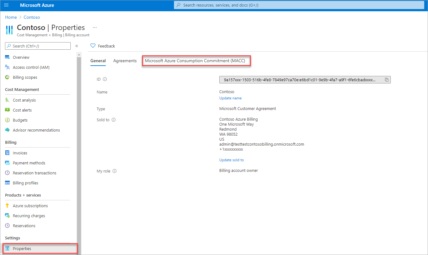 • For MCA customers, select Properties from the left-hand side and then select Microsoft Azure Consumption Commitment (MACC).