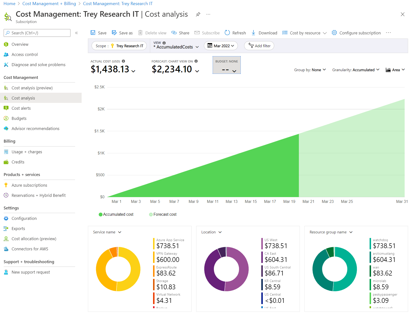 Let's look at a more detailed example of finding a change in cost. When you navigate to Cost Analysis and then select a subscription scope, you start with the Accumulated costs view. The following screenshot shows an example of what you might see.