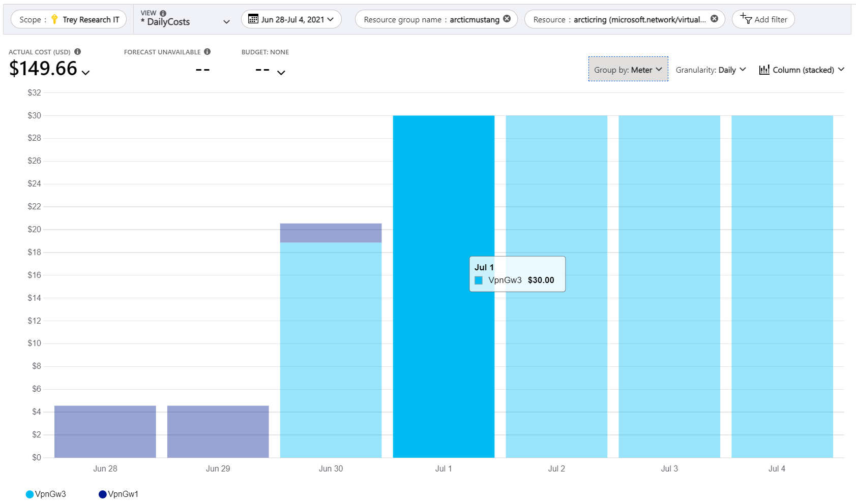 In the previous example, you see that the virtual private network resource named VpnGw1 stopped getting used on June 30. On June 30, a more expensive virtual private network resource named VpnGw3 started getting used.