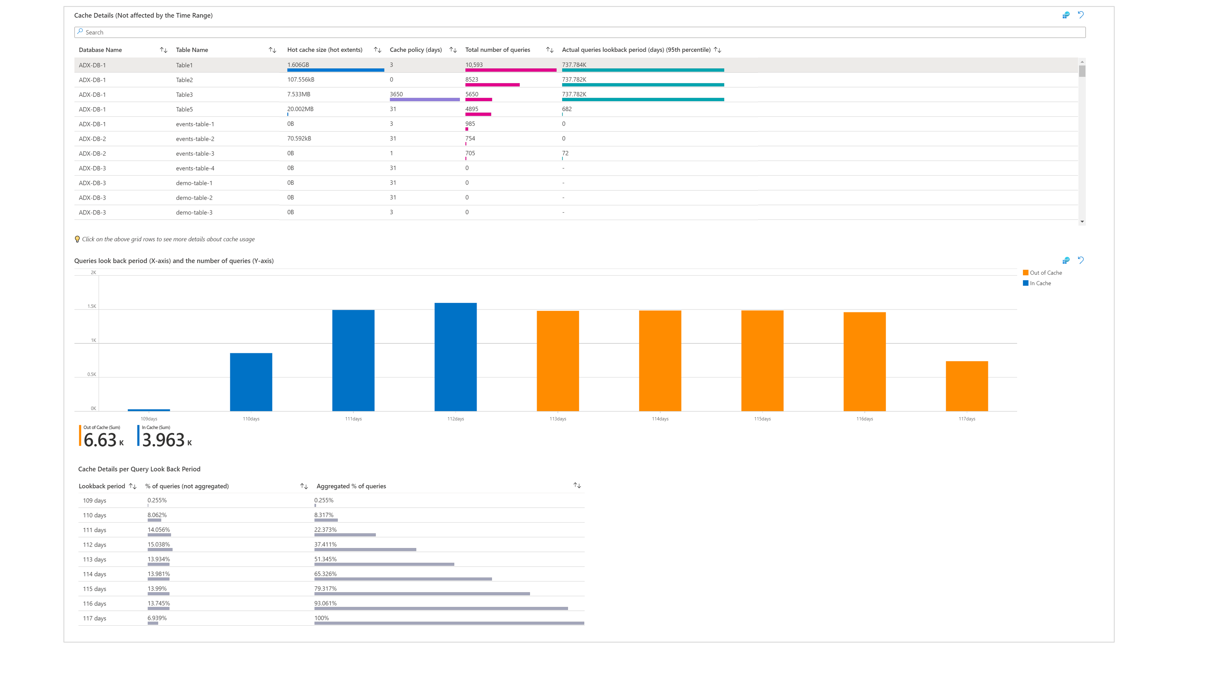 The Cache tab allows users to analyze their actual queries' lookback window patterns and compare them to the configured cache policy (for each table). You can identify tables used by the most queries and tables that aren't queried at all, and adapt the cache policy accordingly.