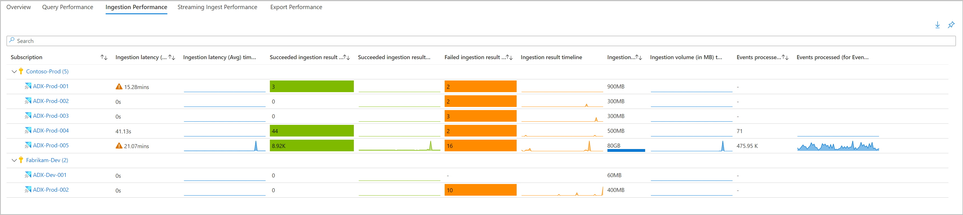 • At-scale perspective. A snapshot view of your clusters' primary metrics helps you track performance of queries, ingestion, and export operations.