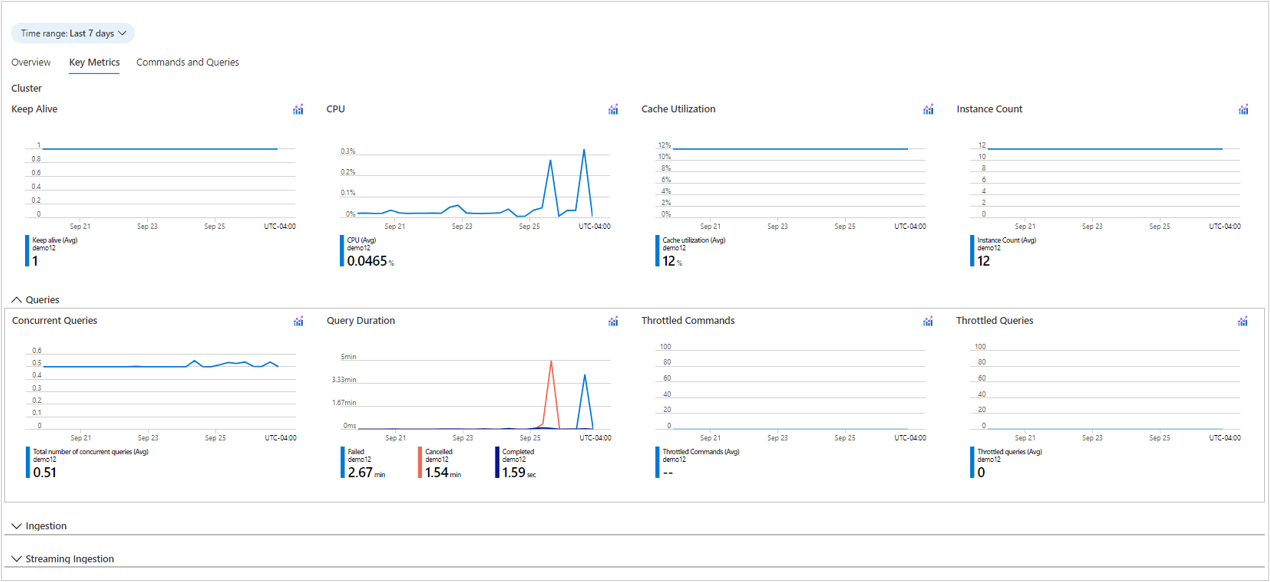 The Key Metrics tab shows a unified view of some of the cluster's metrics. They're grouped into general metrics, query-related metrics, ingestion-related metrics, and streaming ingestion-related metrics.